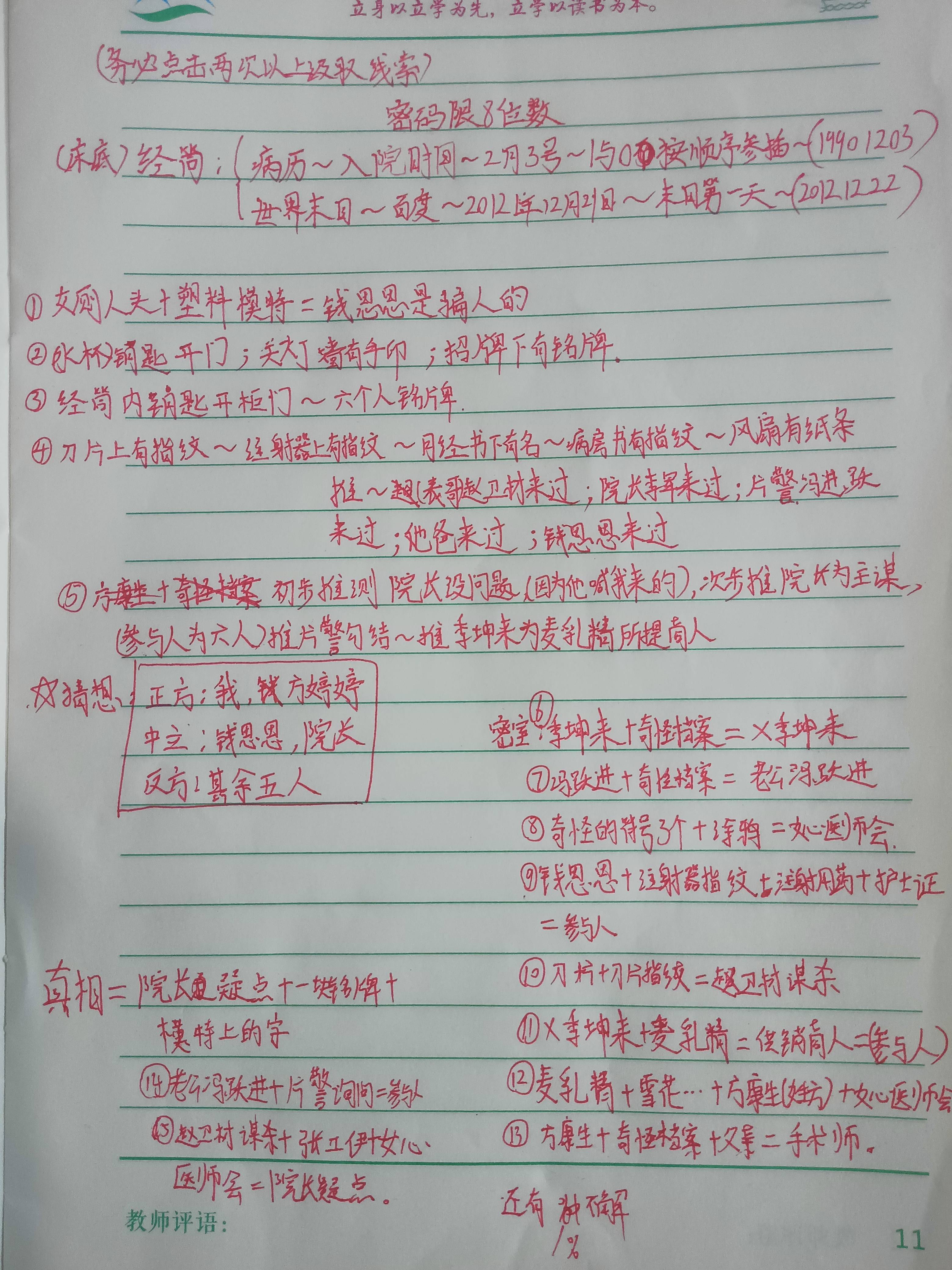 同时笔记还针对案件里两个核心关联人物李坤来、钱思思,梳理了人物关系也做了作案嫌疑推测,把人物线索和现场物证线索结合起来,完整呈现了整个推理分析的过程,笔记末尾还附上了专业教师的指导评语,方便想学的人参考。