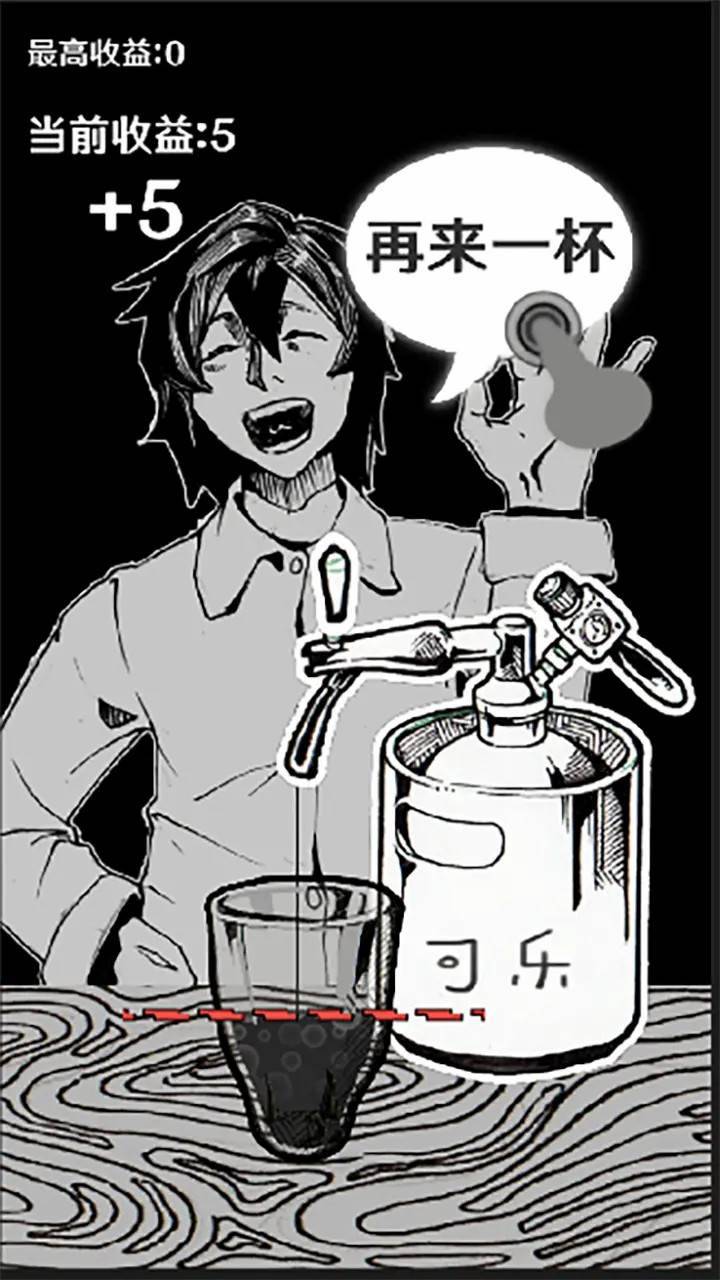 它是手绘漫画风格的休闲挑战,整个游戏画风看着很舒服,没有花里胡哨的特效,玩起来一点不累人。核心玩法就是按照顾客要求倒可乐,不能多倒也不能少倒,刚好到线才算过关,失败了还会出嘲笑声,还挺搞怪的。